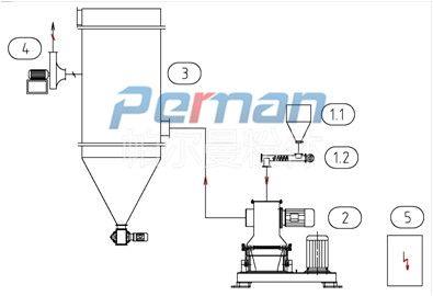 ※ 機體內腔為園筒形,上部份為超微分級機,下部分為超微粉碎機。粉碎室由粉碎盤和磨塊組成,用來將物料擊碎成細粉,分級室由分級葉輪組成,能把細粉分成粒度達標品和未達標品兩種規格,達標品經出料管排出,由旋風集料器收集。未達標品沿腔體內壁回落到粉碎室,繼續粉碎直到達標為止。