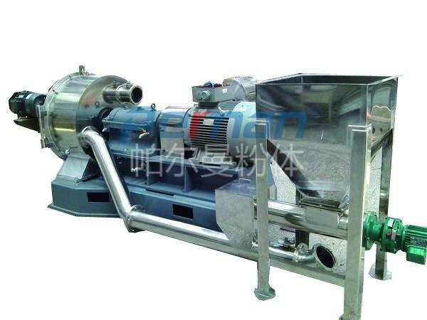 物料由加料系統(tǒng)均勻的送入粉碎室受到高速旋轉(zhuǎn)的粉碎盤的強(qiáng)烈沖擊,同時(shí)受到離心力的作用,與粉碎齒圈發(fā)生碰撞,受到剪切、摩擦、碰撞等多種綜合力的作用,使物料粉碎,被粉碎的物料隨氣流運(yùn)動(dòng)到分級區(qū),通過變頻調(diào)節(jié)的分級輪,對粗細(xì)物料進(jìn)行分離,符合細(xì)度要求的產(chǎn)品隨氣流進(jìn)入旋風(fēng)收集器和除塵器收集,粗物料返回分級區(qū)二次粉碎。