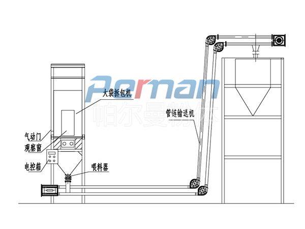 生產原材料會在皮帶輸送的作用進行進入到噸袋拆包機中進行拆包作業,分離出的散料會在出料口直接進入到管鏈輸送機設備入料口中進行傳輸作業。