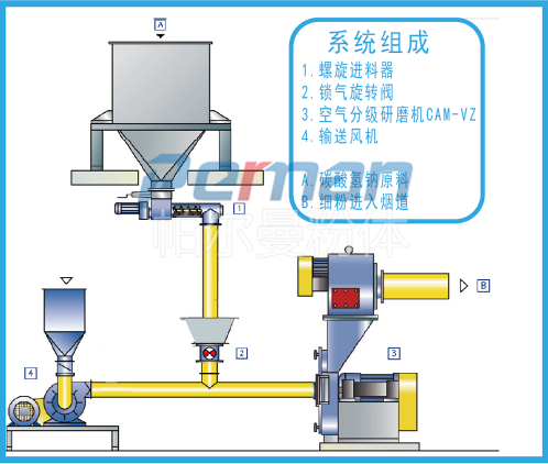 負壓空氣研磨系統的設備積垢問題經常是討論的焦點。設備的清洗,特別是輸送風機的清洗過于耗時。此外,在開機和關機過程中風機葉輪上的積垢還可能剝落,導致風機的振動及其運轉狀態的振蕩。因此可考慮由負壓流程改為正壓流程。在新的工作模式下風機安裝在分級磨之前,將工藝空氣壓入研磨系統。這種工作模式的優點是研磨后的碳酸氫鈉不通過風機運輸,完全避免了風機的積垢問題。此外風機的耗電也有所降低,使經營成本更低,但是對設備的密封性能提出了更高的考驗,無論是設備的設計結構、加工精度及配合都有嚴格的要求,設備的造價成本也會更高。
