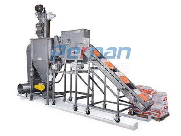 篩分裝置:篩分裝置中滾筒篩壁面布滿篩孔,篩板表面固定有可活動的6塊斜板,此斜板起到內螺旋的作用。廢袋和物料進入滾筒篩內,滾筒篩低速旋轉,加速物料透過篩孔落入錐斗內,廢袋由滾筒篩內螺旋輸送到滾筒出口,并掉落到廢袋輸送機內。