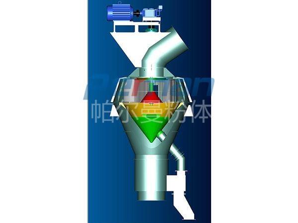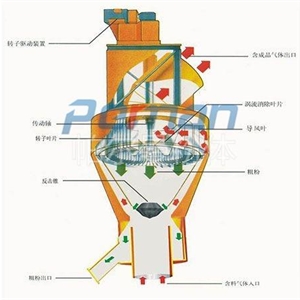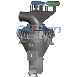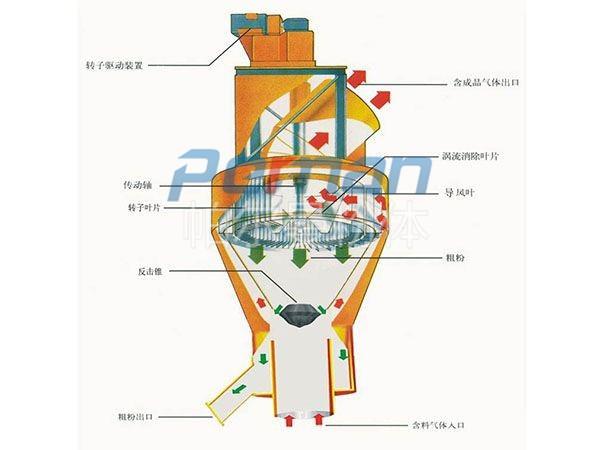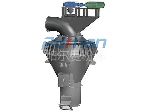氣流分級(jí)機(jī)與旋風(fēng)分離器、除塵器、引風(fēng)機(jī)組成一套分級(jí)系統(tǒng)。物料在風(fēng)機(jī)抽力作用下由分級(jí)機(jī)下端入料口隨上升氣流高速運(yùn)動(dòng)至分級(jí)區(qū),在高速旋轉(zhuǎn)的分級(jí)渦輪產(chǎn)生的強(qiáng)大離心力作用下